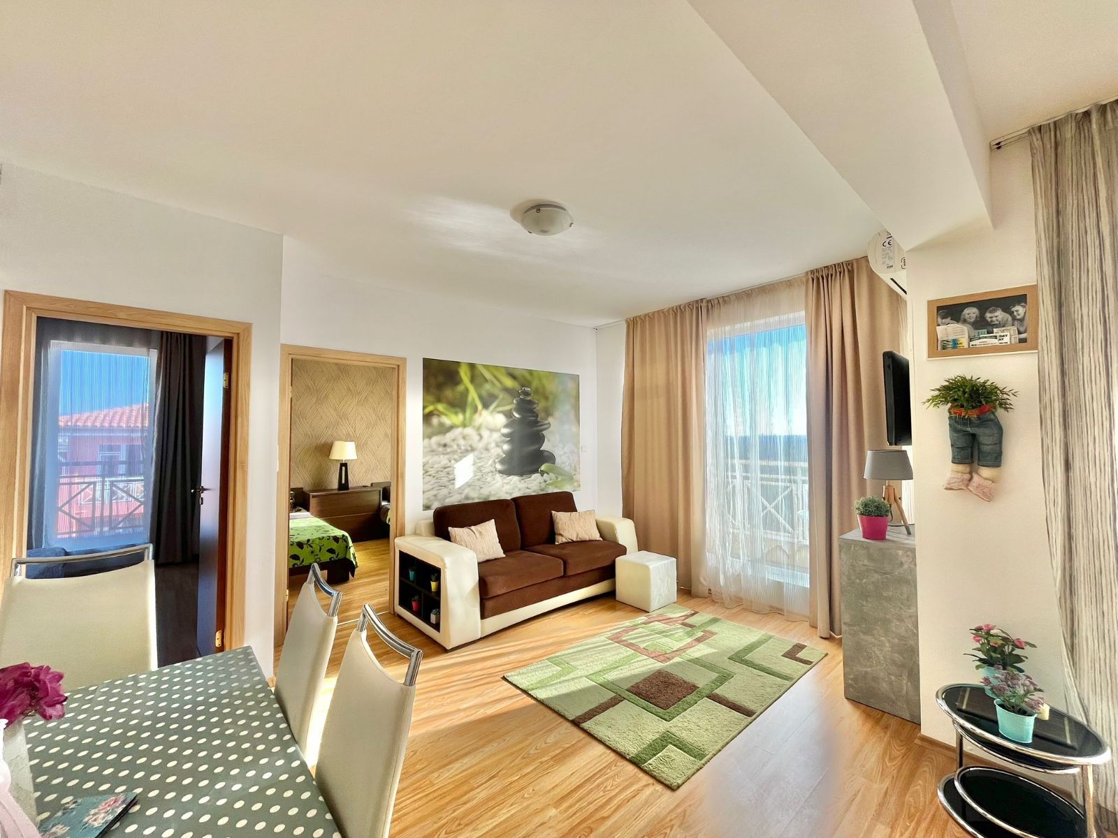 Предлагаме за продажба хубаво обзаведен апартамент с 2 спални в комплекс Съни Дей 6 на 4 км от Слънчев бряг. Апартаментът е в перфектно състояние, има всичко необходимо за живеене - добри климатици, мебели и уреди. Апартаментът се състои от антре, дневна с кухненски бокс и кът за сядане, две спални, баня с тоалетна и две тераси. Площ на апартамента е 77м2