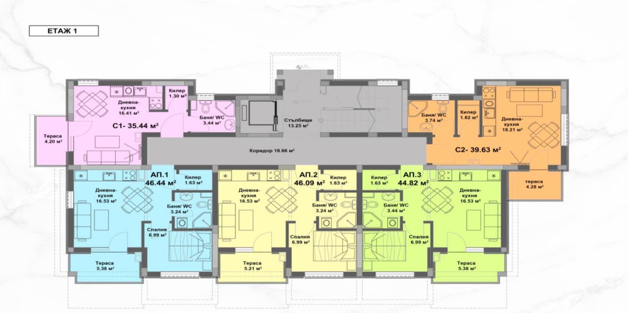 Студиото е с площ 35.44 м2 и се намира на първи етаж. Състои се от всекидневна, баня с WC и тераса.