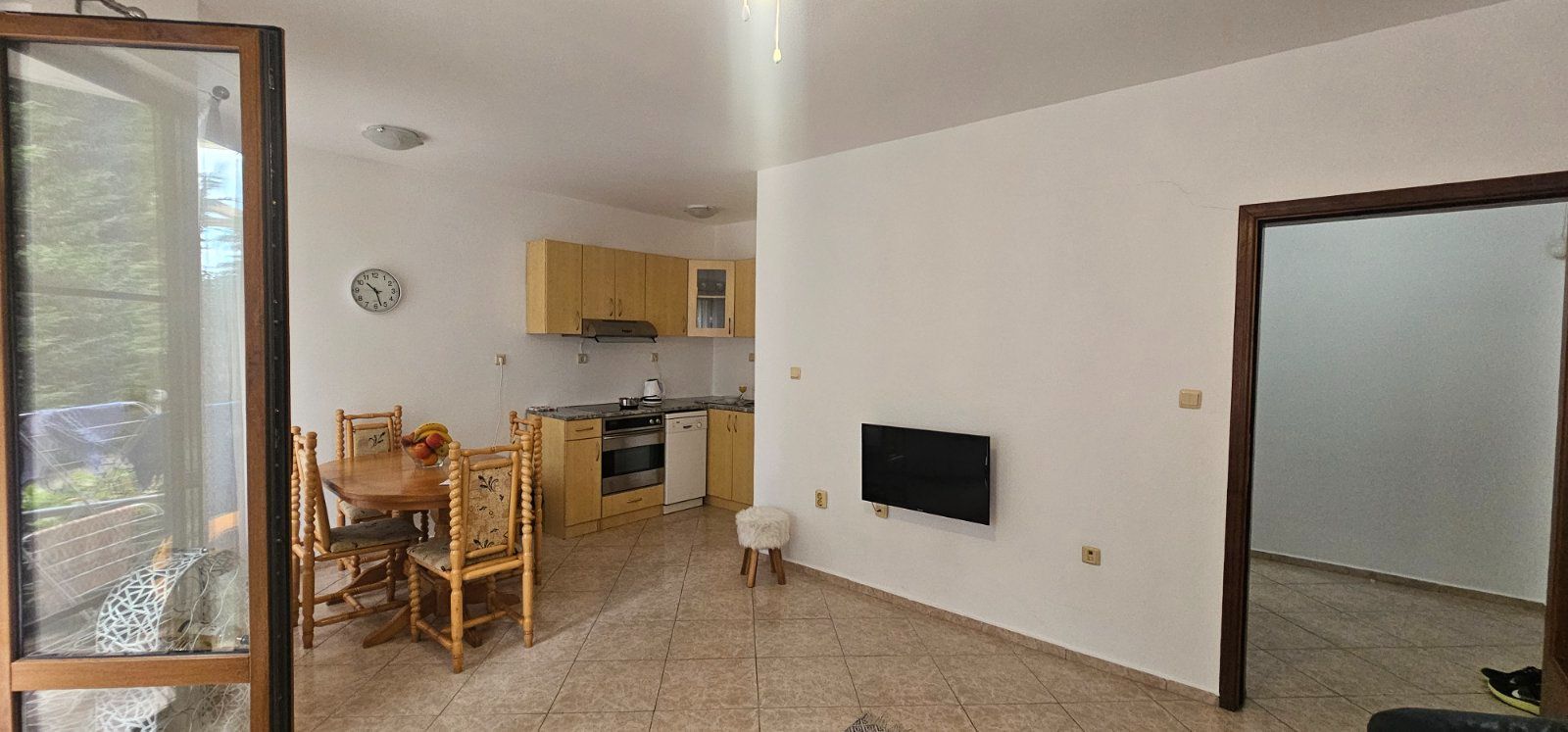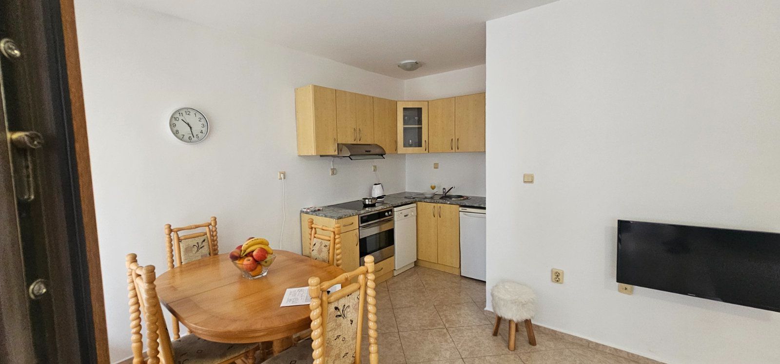 Просторна дневна зона с трапезария и кухня, оборудвани с всички необходими електроуреди.