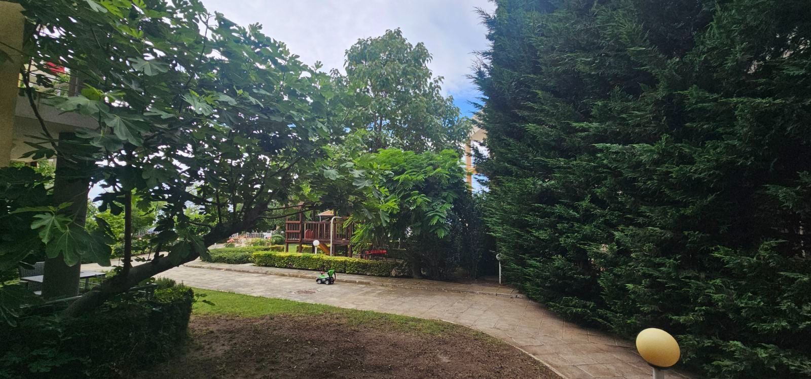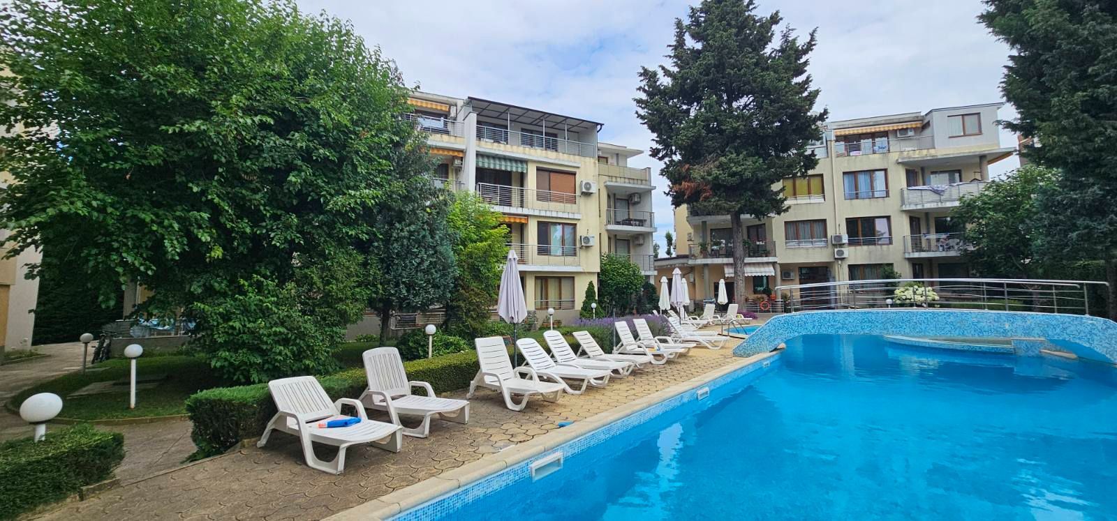 На територията има басейн, детска площадка, зелени кътове за отдих, пейки, паркомяста. Дворът е чист и спокоен, охраната осигурява безопасност, а управляващото дружество следи за реда. Комплексът е особено предпочитан от семейства с деца и тези, които ценят тишината далеч от градския шум. В близост-магазини, аптеки, транспортни спирки, аква парк и кафенета. Старият град на Несебър е на няколко минути с кола. Можете да се разхождате по брега, да правите пикници или просто да се насладите на гледката към морето от балкона.