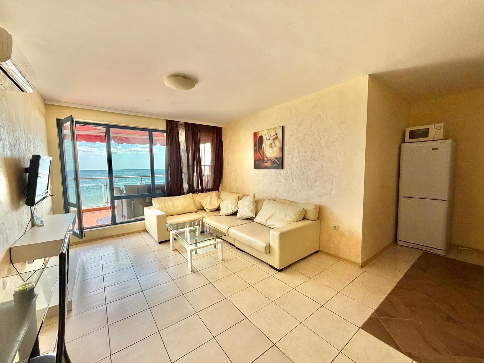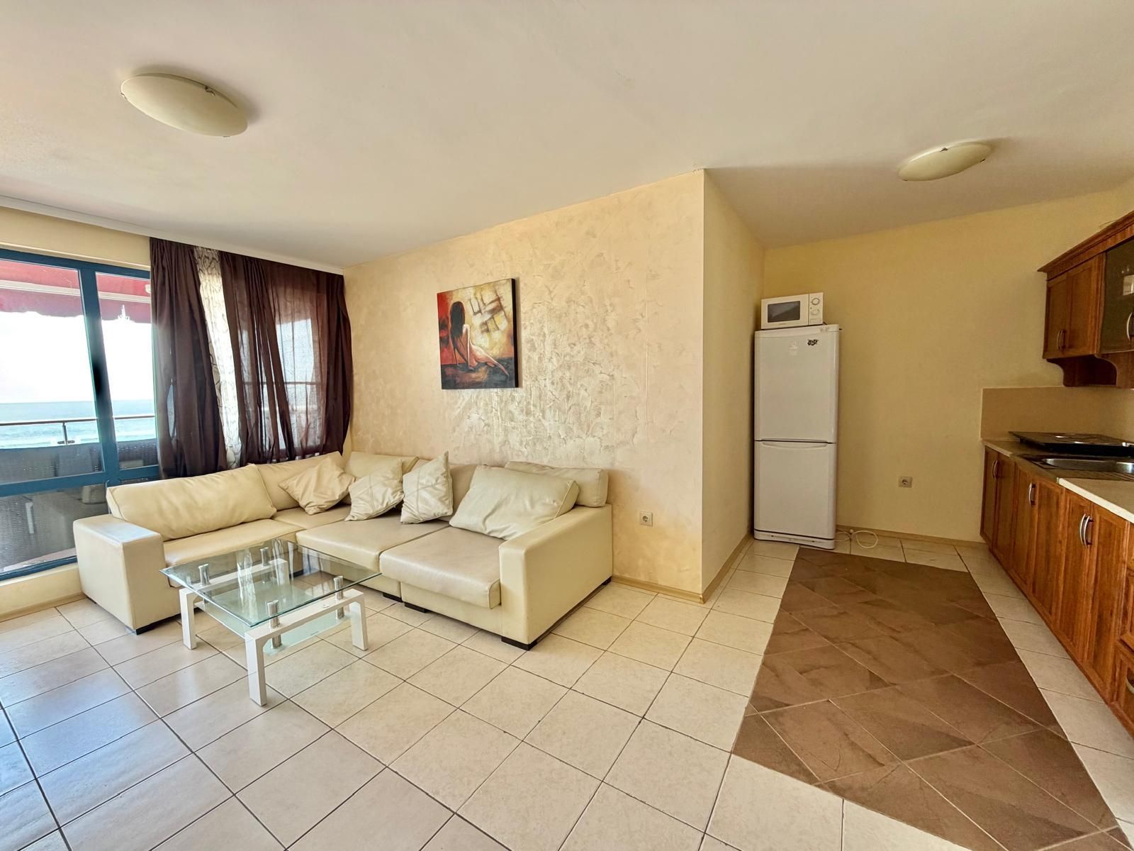 Предлагаме изключителен двустаен апартамент, разположен буквално на самия морски бряг, върху златистия пясък, с фронтална и напълно открита гледка към морето.
